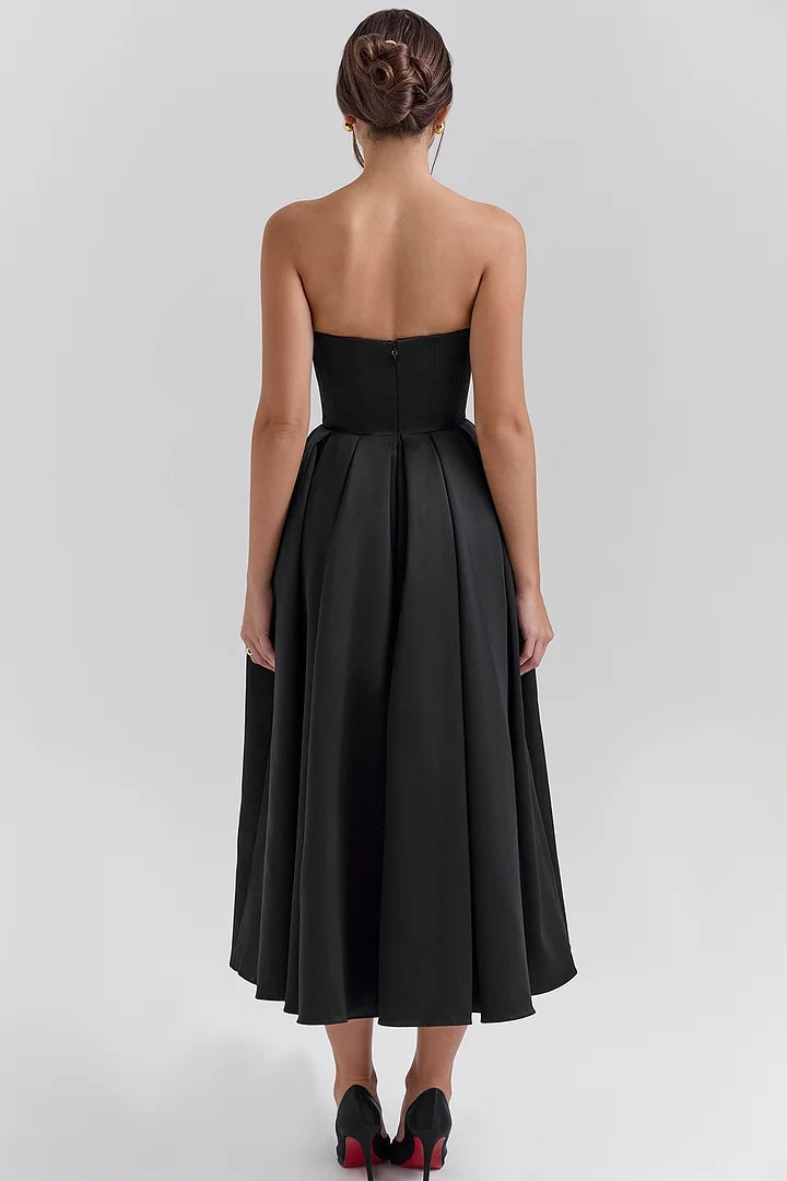 The Contesa Dress is the ultimate expression of timeless sophistication. With its strapless neckline and structured bodice, it exudes classic elegance while showcasing a modern, minimal edge. The midi-length skirt flows gracefully with every step, creating a silhouette that is both powerful and feminine—perfect for occasions where poise and refinement are key.
