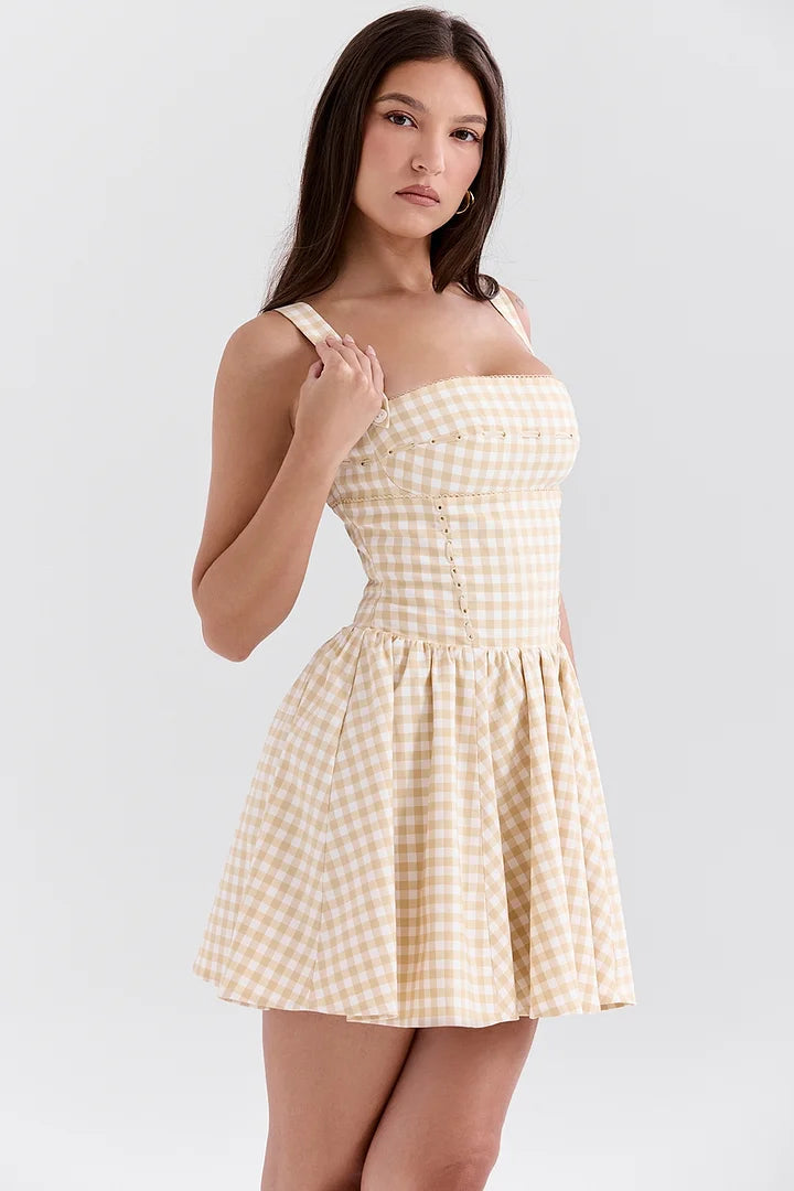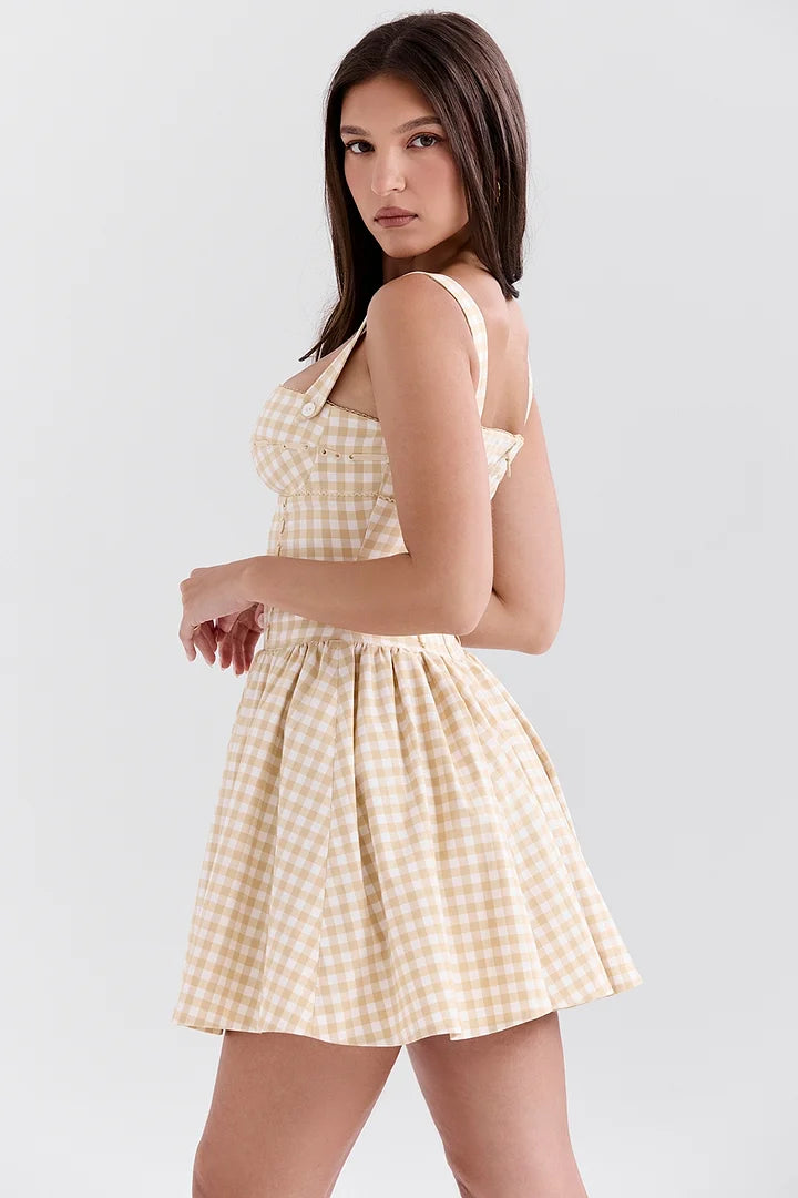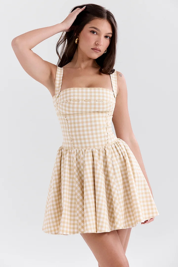 The Isadora Dress is the perfect blend of playful charm and timeless femininity. With its sweet gingham pattern in soft beige and white, it instantly evokes carefree summer days and effortless style. The fitted bodice with wide straps flatters the figure, while the flared mini skirt adds a youthful, flirty touch that’s perfect for any casual outing.