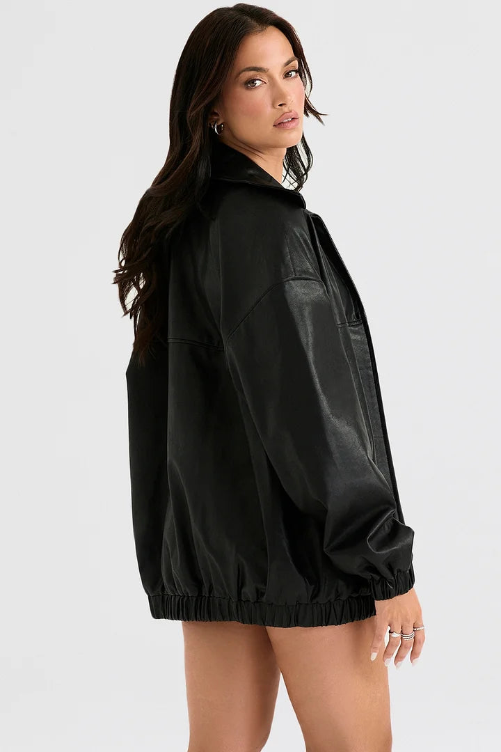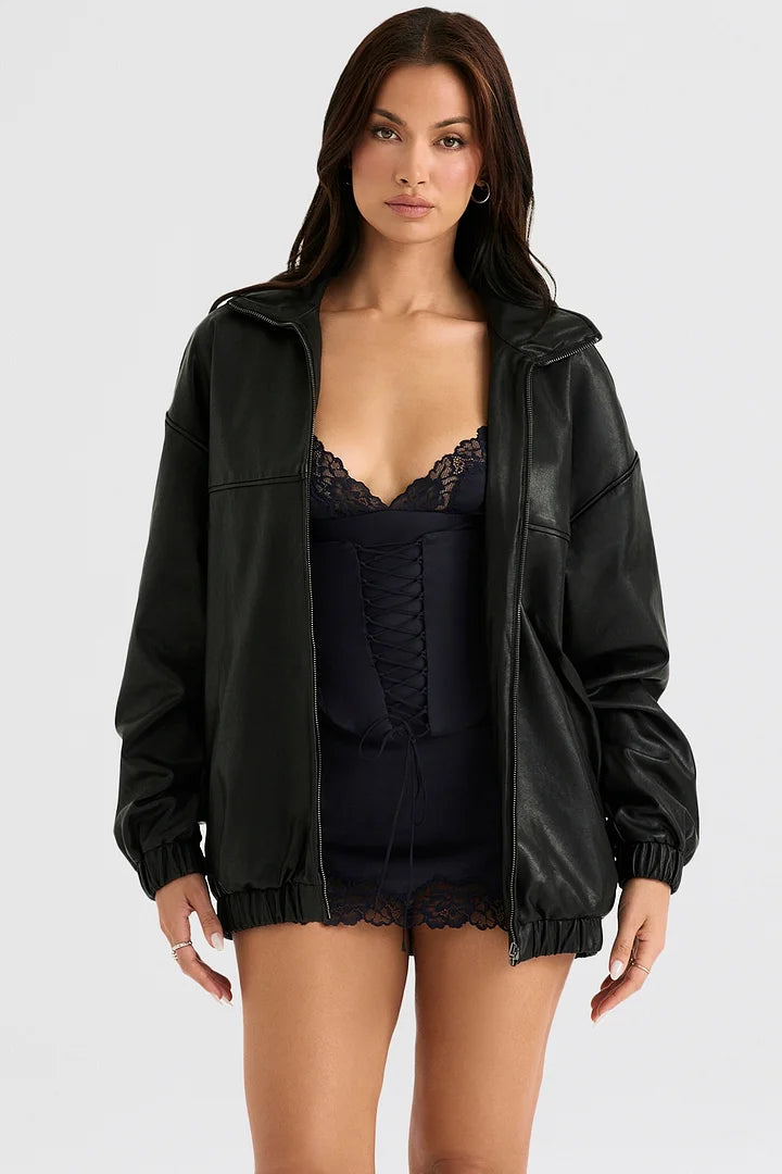 The Larissa Set is the perfect blend of sultry femininity and edgy street-style cool. Designed as a daring combination, it features a fitted lace-trimmed corset mini with intricate details that flatter the figure, paired with a relaxed oversized leather jacket that adds contrast and attitude. The result is a bold, confident look that effortlessly transitions from night-out glam to elevated streetwear.