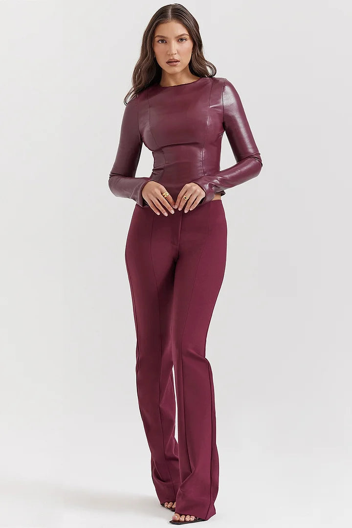 The Lillie Set is a striking combination of sleek edge and refined femininity. Featuring a form-fitting, long-sleeved faux leather top in a deep wine shade paired with perfectly tailored matching trousers, this look embodies confidence and modern sophistication.